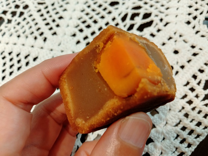 あひるの卵の黄身の塩漬け入り。塩漬け卵の塩味のアクセントが利いてます。餡はハスの実の餡で、マイルドな甘み。日本のお菓子では、卵を形のまま入れ込んだりすることって、あまりないけれど、慣れると結構おいしい。ピータン好きにもおすすめ。
