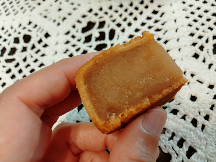 ココナッツ餡の月餅。ココナッツの香りとサクサク感がクセになる。これだけ我慢できず、写真撮る前にうっかりモグモグしてしまいました。スミマセン。モグモグ。