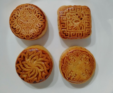 同じショップのものでも、フレーバーによって模様が違います。この4つは萬珍楼の月餅。伝統的には、木型を使ってこのような模様をつけるのだとか。日本でも打菓子などの和菓子に木型を使いますね。
